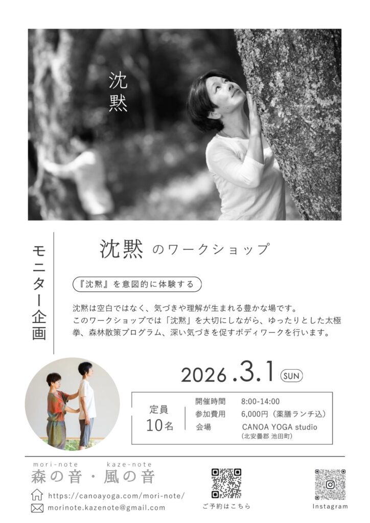 このワークショップでは「沈黙」を大切にしながら、ゆったりとした太極拳、森林散策プログラム、深い気づきを促すボディワークを行います。思考を休め、呼吸と感覚に戻ることで、心身の緊張がほどけ、本来のリズムがよみがえっていきます。
